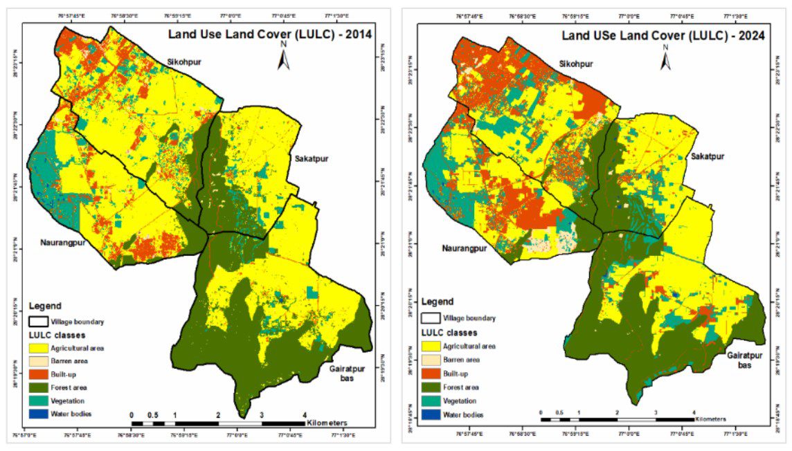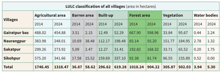 Using LISS-IV satellite imagery for 2014 and 2024, the LULC change detection over the past decade reveals a significant shift from agricultural to built-up areas, with agricultural land decreasing from 1749.4 to 1320.7 ha, most notably in Shikohpur and Naurangpur, while built-up areas nearly doubled from 297.1 ha to 620.3 ha. Shikohpur alone saw an increase of 177.4 ha in built-up land. A total loss of 114 ha of forest was recorded, with Gairatpur Bas witnessing the maximum decline due to urbanisation.