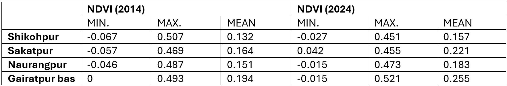 In the study area, mean NDVI ranges between 0.13 – 0.25, this indicates that the area has widespread sparse or degraded vegetation, necessitating large-scale scientific interventions for eco-restoration.