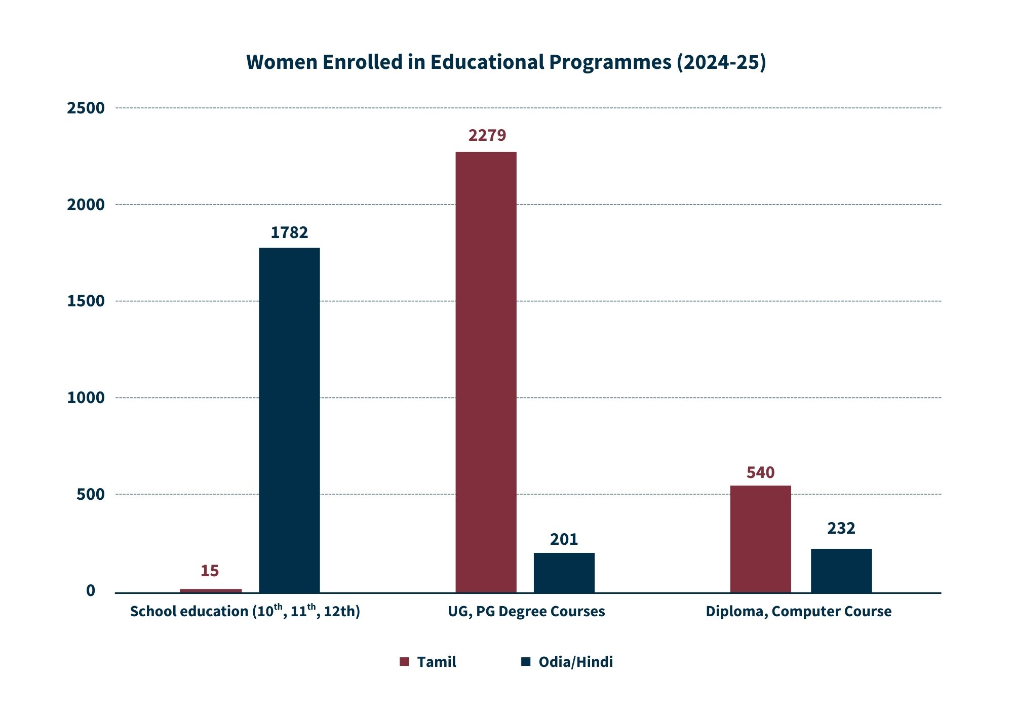Of the approximately 30,000 female employees at KPR, 5,049 women were enrolled in educational programmes as of 2024–25. Of these, Hindi and Odia- speaking workers from northern and eastern states show significantly higher enrolment in school-level education, a reflection of poorer educational attainment in their home states. Tamil-speaking workers, benefiting from Tamil Nadu’s relatively stronger school education system, are more heavily represented in undergraduate and postgraduate courses and diploma programmes.